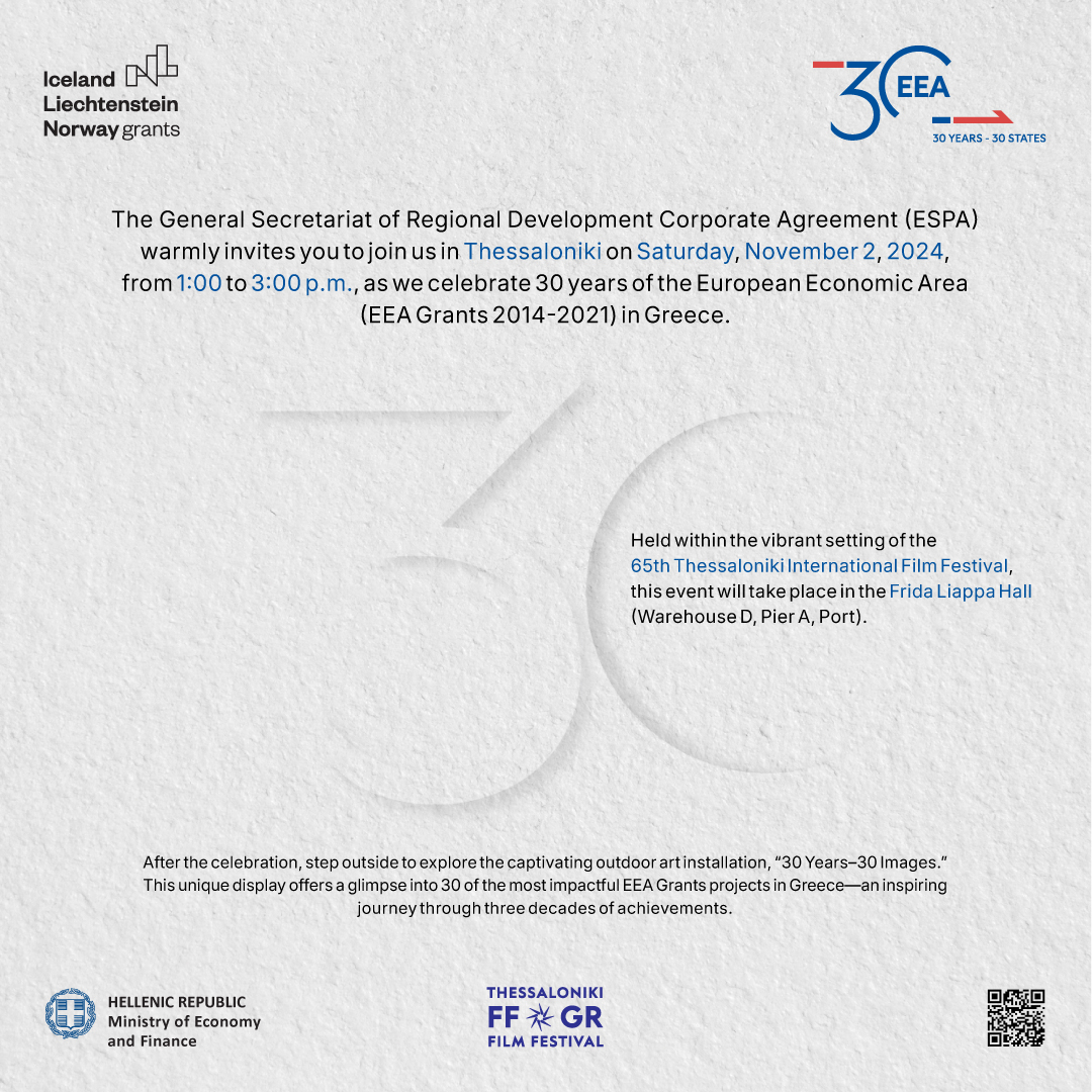 The first celebration will be held in Thessaloniki on Saturday, November 2, during the 65th Thessaloniki International Film Festival. Hosted at 1:00 p.m. in Frida Liappa Hall in Warehouse D at the port, this event will gather government officials, representatives from EEA countries, local authorities, and beneficiaries of EEA Grants to share their insights and stories.